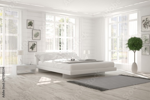 Free Art Print Of Scandinavian Minimalist Bedroom With Big Window And Herringbone Parquet White And Gray Interior Design Top View